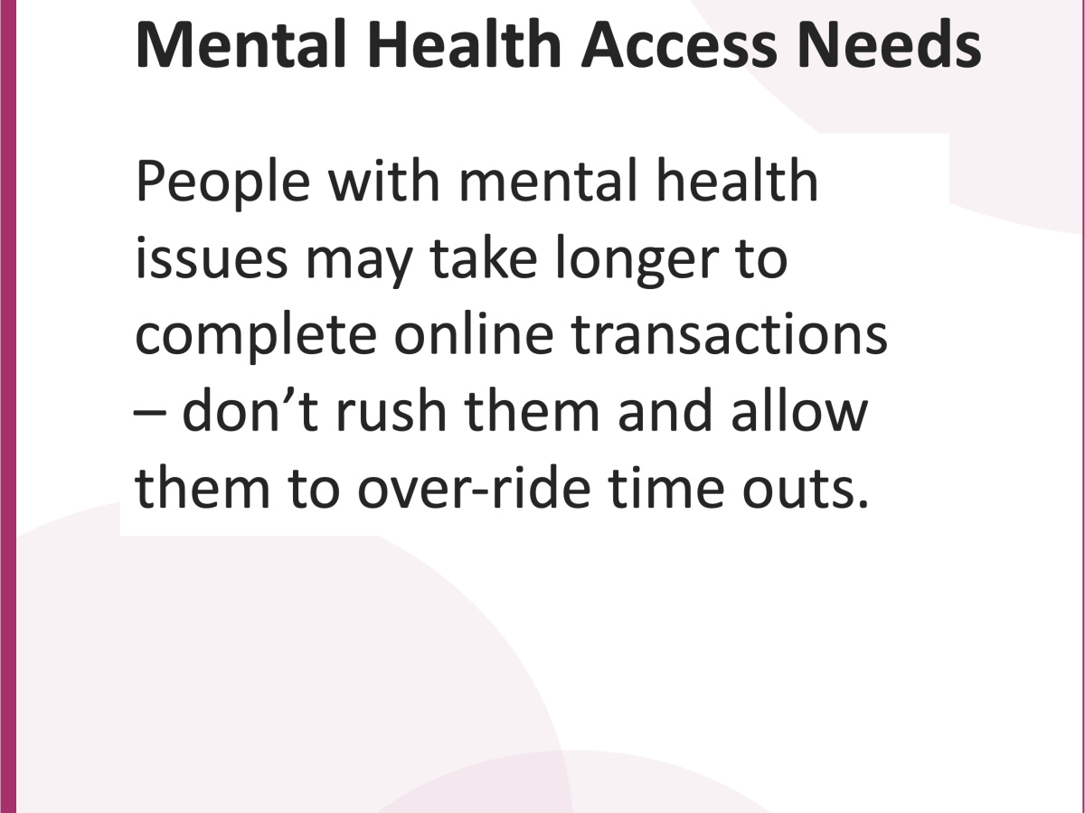 - People with mental health issues may take longer to complete online transactions. Don't rush them and allow them to over-ride time outs.